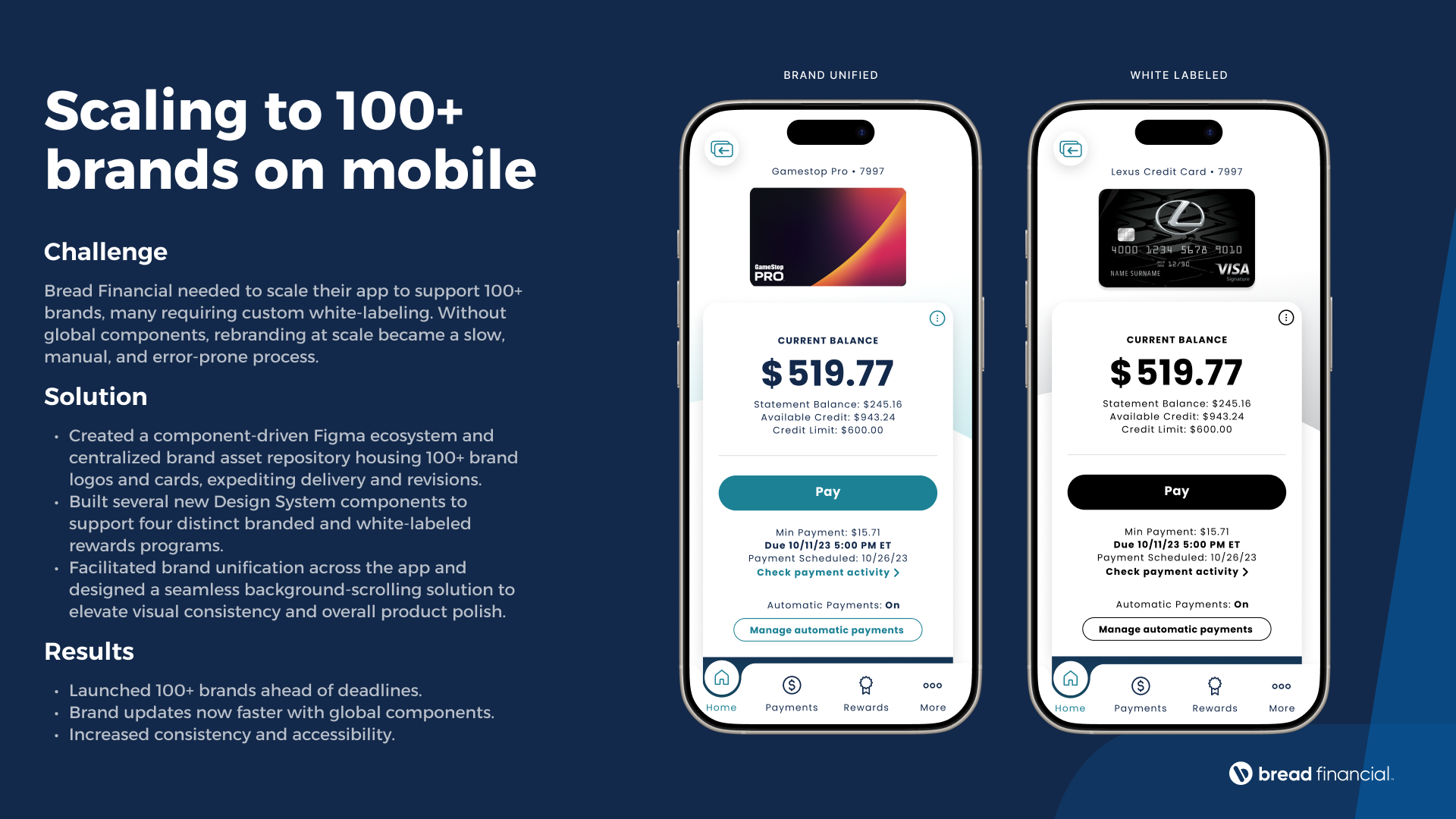 Bread needed to scale its app to support 100+ brands with varying white-label needs. Without global components, rebranding was slow, manual, and error-prone.