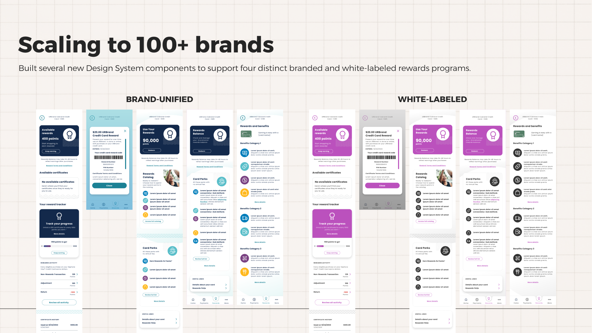 Built a component-driven Figma ecosystem and centralized brand asset repository, plus scalable Design System components supporting four branded and white-labeled rewards programs.